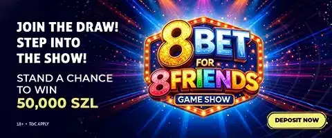 Join the 8Bet for 8Friends Tournament and turn every deposit into points as you climb the leaderboard. The top 4 players at the end of the tournament will earn an exclusive invitation to participate in our exciting Game Show, where they stand a chance to win up to 50,000 SZL. Deposit more, rise higher, and secure your spot in the spotlight!